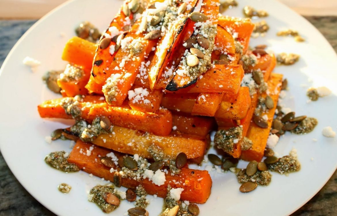 ROASTED BUTTERNUT SQUASH STICKS WITH SAGE PUMPKIN SEED PESTO