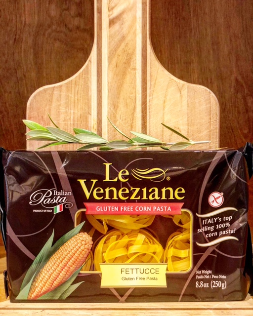 Le Veneziane gluten free corn pasta Fettuce cut. This slightly thicker wide pasta is 100% gluten free.